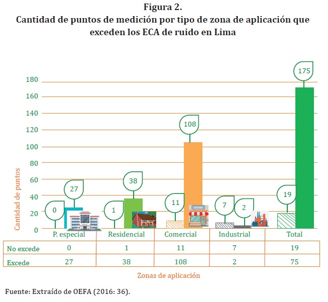 Figura 2: OEFA (2016). Cantidad de puntos de medición por tipo de zona de aplicación que exceden los ECA de ruido en Lima. En La contaminación sonora en Lima y Callao (p. 36).