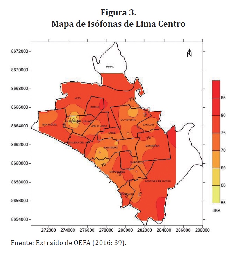Figura 3. OEFA (2016). Mapa de isófonas de Lima Centro. En La contaminación sonora en Lima y Callao (p. 39).