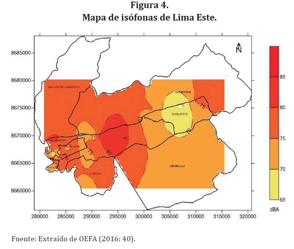 Figura 4. OEFA (2016). Mapa de isófonas de Lima Este. En La contaminación sonora en Lima y Callao (p. 40).