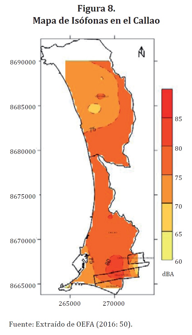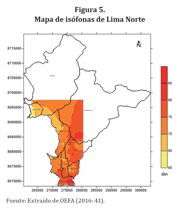 Figura 5. OEFA (2016). Mapa de isófonas de Lima Norte. En La contaminación sonora en Lima y Callao (p. 41).