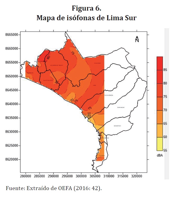 Figura 6. OEFA (2016). Mapa de isófonas de Lima Sur. En La contaminación sonora en Lima y Callao (p. 42).
