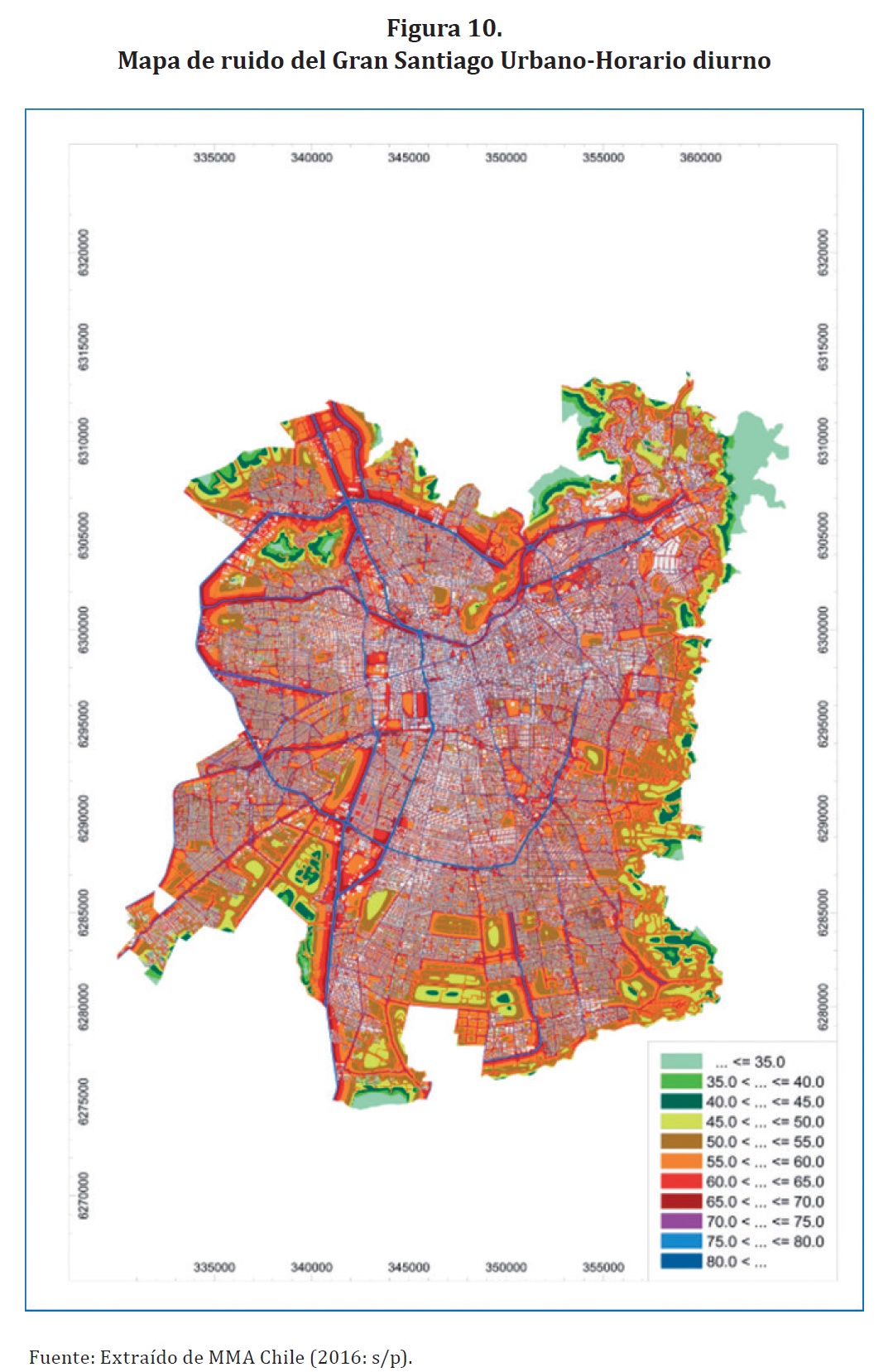 Figura 10. Ministerio del Medio Ambiente de Chile (2016: s/p). [Mapa]. Mapa de ruido del Gran Santiago Urbano-Horario diurno. Línea mapas de ruido. https://ruido.mma.gob.cl/mapas-de-ruido/