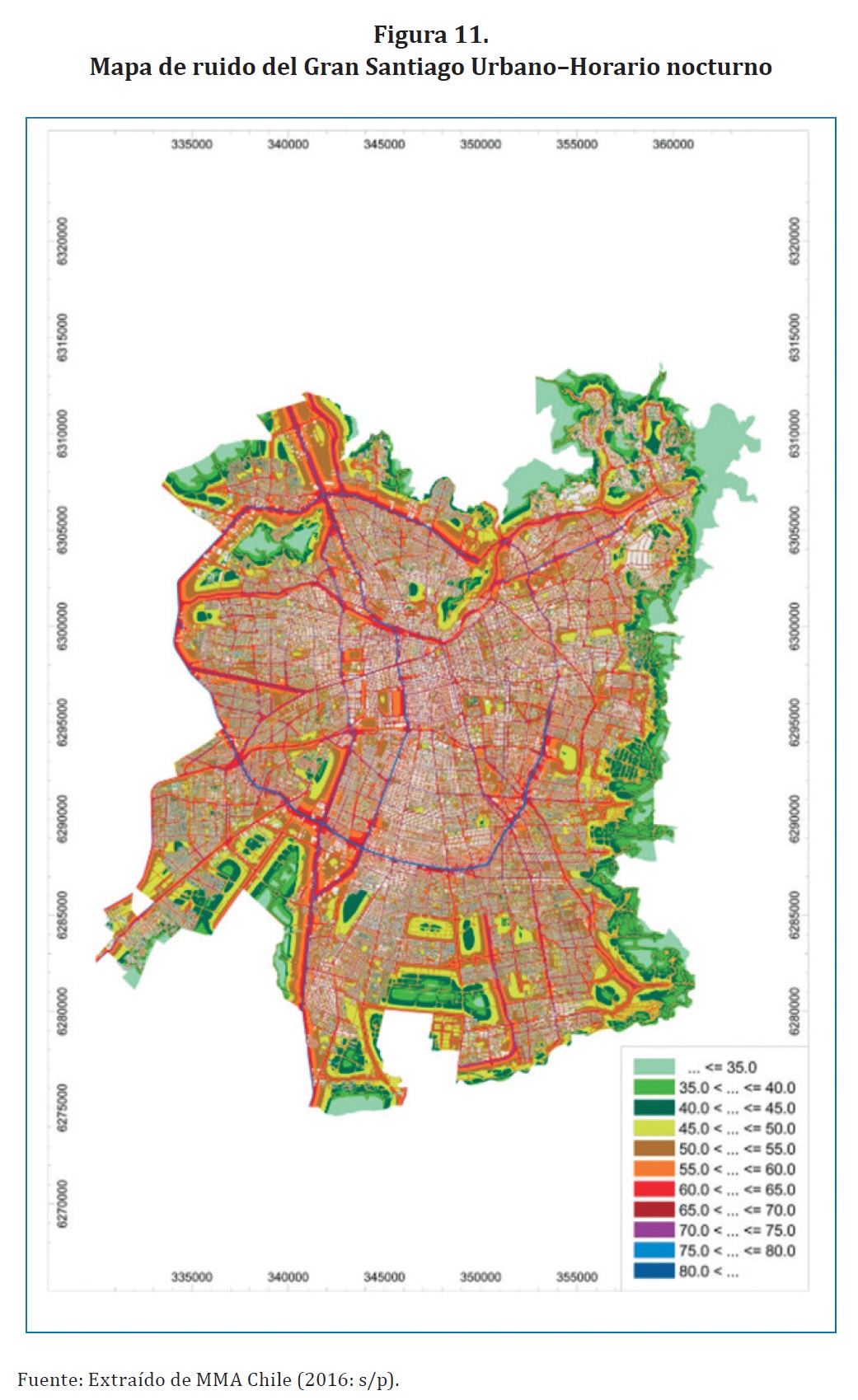 Figura 11. MMA Chile (2016: s/p). [Mapa]. Mapa de ruido del Gran Santiago Urbano-Horario nocturno. Línea mapas de ruido. https://ruido.mma.gob.cl/mapas-de-ruido/