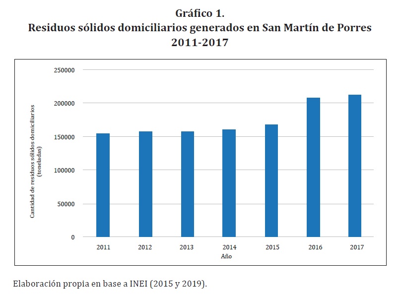 En primer lugar, está el distrito de San Martín de Porres, ubicado en Lima Norte. Según el Instituto Nacional de Estadística (INEI) (2007), en su Censo Nacional realizado en el año 2007, se registró un total de 579.561 habitantes, siendo su GPC de 0,611 kg/hab/día (según su Estudio de Caracterización de Residuos Sólidos 2016). Su generación de residuos sólidos domiciliarios ha aumentado a través de los años (gráfico 1), siendo la disposición de sus residuos en los rellenos sanitarios de Huaycoloro y Zapallal hasta 2014, posterior a ese año, la disposición se realiza, hasta la actualidad, en Zapallal y Modelo de Callao (INEI 2015, 2019).
