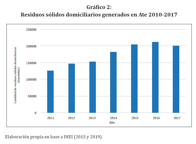 En segundo lugar, se tiene al distrito de Ate, el cual está ubicado en Lima Este, contando con una población de 478.278 habitantes según el Censo Nacional de 2007 (INEI 2007) y con una GPC de 0,622 kg/hab/día (Municipalidad de Ate 2017). La generación de residuos sólidos en este distrito ha variado en el tiempo (gráfico 2), con aumentos y disminuciones, asimismo, la disposición de sus residuos sólidos se realiza en el relleno sanitario de Huaycoloro, hasta la fecha (INEI 2015 y 2019).