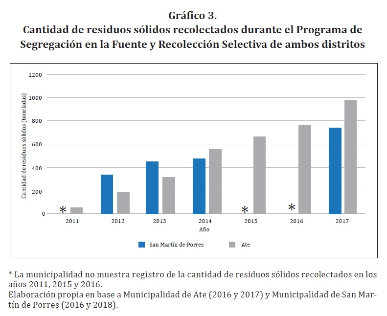 * La municipalidad no muestra registro de la cantidad de residuos sólidos recolectados en los años 2011, 2015 y 2016. Elaboración propia en base a Municipalidad de Ate (2016 y 2017) y Municipalidad de San Martín de Porres (2016 y 2018).