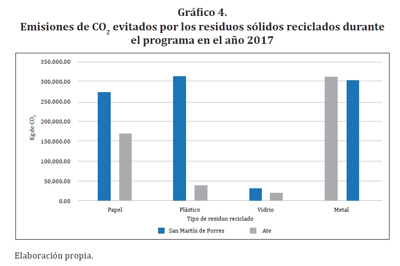 Ate, en el año 2017, presentó una recolección de 337,37 toneladas de papel, 774,75 toneladas de plástico, 172,36 toneladas de vidrio y 156,46 toneladas de metal; por otro lado, San Martín de Porres presentó 207,96 toneladas de papel, 99,52 toneladas de plástico, 101,8 toneladas de vidrio y 154,02 toneladas de metal, respectivamente. En consecuencia, se observa una mayor cantidad de kg de CO2 evitados en papel y plástico por parte de Ate, debido a que, a diferencia de San Martín, recolectó más residuos de ese tipo, sin embargo, en metal y vidrio la cantidad es similar en ambos.