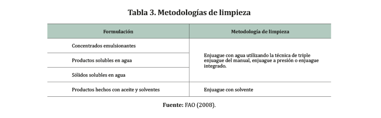 Para el manejo de envases de plaguicidas, la opción operativa y económicamente más viable resulta ser los métodos de limpieza. Esta dependerá de las características físicas y químicas del plaguicida. Las metodologías de limpieza que existen se muestran en la Tabla 3.