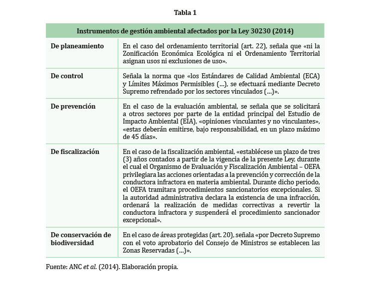 Estas normas han diluido o limitado las facultades y competencias del sector ambiental en aspectos de gestión ambiental, instrumentos de control, prevención, fiscalización y de creación de áreas protegidas. Específicamente, respecto de la ley 30230, presentamos de manera sucinta los cambios incorporados.