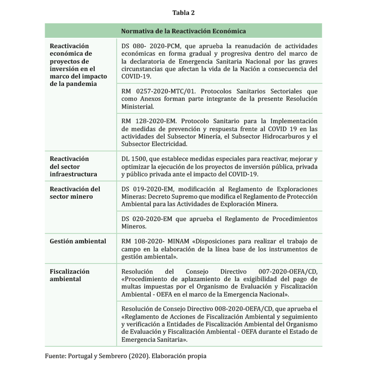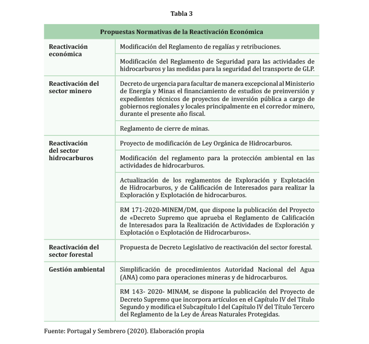 De manera específica, en las propuestas políticas y legales relacionadas con la reactivación económica y la perspectiva ambiental y social, podemos encontrar que el foco de la reactivación será la actividad extractiva; tal como se viene dando en los cambios legales de ciertos sectores como hidrocarburos, forestal y minero, este último resaltado en el discurso del expremier Cateriano. Aprovechar la oportunidad de la diversificación productiva de nuestra economía y del plan de 2014 (Machado 2014: 37) quedó atrás, así como otras propuestas de innovación e inversión en tecnología y conocimiento. En la siguiente tabla mencionaremos las normas más importantes para los planes de recuperación económica, pues en total estamos hablando de más de cien normas aprobadas en los últimos cinco meses.