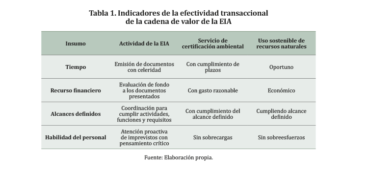 La efectividad transaccional es la capacidad de lograr el uso sostenible de los recursos naturales debido a la gestión eficiente de recursos para ejecutar la EIA y ofrecer el servicio de certificación ambiental, acorde al desarrollo o cambios en las políticas institucionales y demás pertinentes. De forma tradicional, se considera que la efectividad transaccional está en función a la inversión de tiempo y dinero como factores clave; sin embargo, Theophilou, Bond y Cashmore (2010) consideran, adicionalmente, a las categorías de especificación de roles (alcance) y habilidades, que, junto al tiempo y a los recursos financieros, reflejan cómo se invierten los recursos en la EIA.