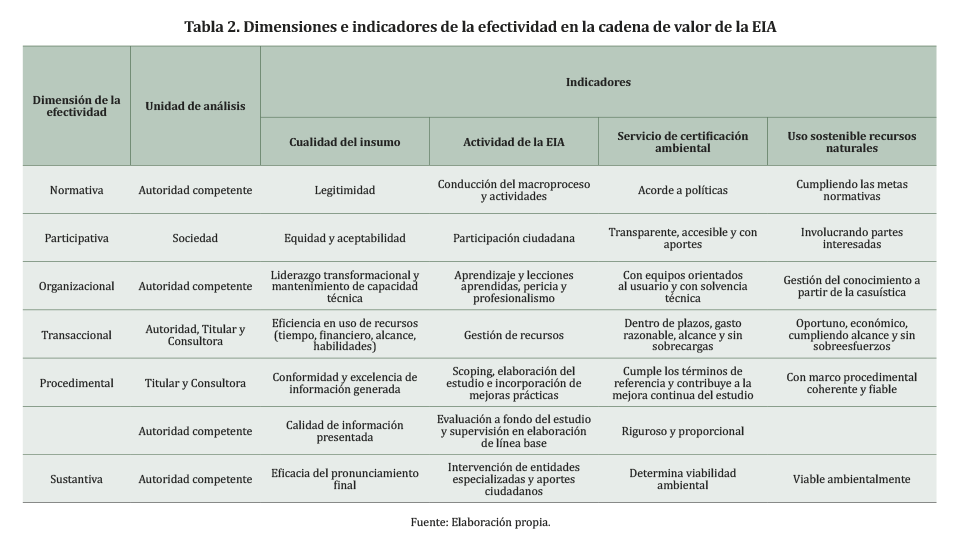 La investigación distingue seis dimensiones que constituyen la cadena de valor para la efectividad de la EIA en el Perú: normativa, participativa, aprendizaje organizacional, transaccional, procedimental y sustantiva. Estas dimensiones fueron determinadas en la presente investigación, en concordancia con aquellas definidas por Bond, Pope y Morrison-Saunders (2015), que indican que la efectividad tiene seis dimensiones: procedimental, sustantiva, transaccional, normativa, de pluralismo, de conocimiento y aprendizaje, las cuales guardan relación con los trabajos de Chanchitpricha y Bond (2013), Shakil y Ananya (2015), Kolhoff et al. (2016), Günther, Geibler y Köppel (2017), Bond et al. (2018), Pope et al. (2018), Zhang, Kørnøv y Christensen (2020) y Khan, Chaudhry, Ahmad, Mehmood y Saif (2020), que recogen objetivamente la experiencia en la performance, la calidad y la efectividad de la EIA en diversas partes del mundo. Asimismo, las dimensiones responden a las recomendaciones de Nita (2019) para potenciar el conocimiento de las evaluaciones de impacto ambiental, enfocar sus principales beneficios y problemas, y mejorar la calidad y eficacia de los procesos formales; de la Comisión para el Desarrollo Minero Sostenible (2020), en los ejes de entorno social: ciudadanía, diversidad y territorio, gestión ambiental y mejora regulatoria; y de Espinoza (2020), en la calidad de certificación ambiental para los proyectos energéticos para abordar los problemas ambientales y sociales que ahora enfrentamos y las tendencias en las futuras décadas.