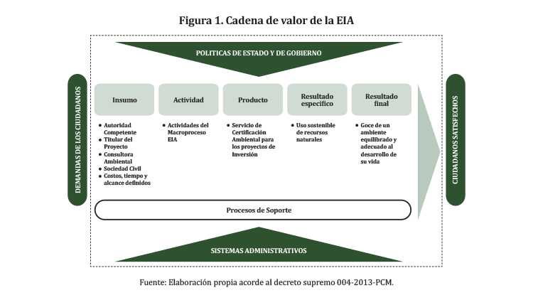 En el Perú existen normas que respaldan la implementación de la gestión por procesos orientadas a resultados, con el fin de satisfacer las necesidades de las partes interesadas, como la Política Nacional de Modernización de la Gestión Pública, aprobada por decreto supremo 004-2013-PCM. De acuerdo con ello, la efectividad de la EIA debe entenderse sobre la base de una cadena de valor para la gestión por resultados (Figura 1), con los siguientes elementos: