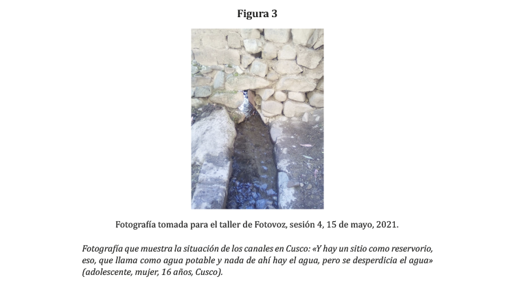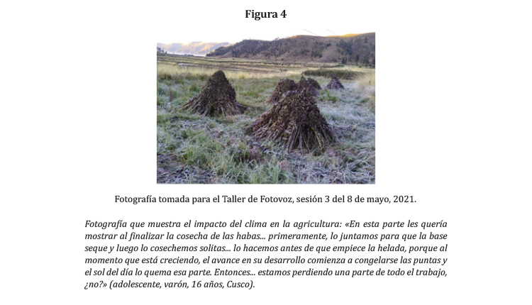 Los talleres de Fotovoz y las entrevistas fueron grabadas y posteriormente transcritas. En cuanto al análisis de la información, para las sesiones de Fotovoz se seleccionaron, por cada región, las fotografías e historias que mejor ejemplificaran las percepciones del cambio climático. Las entrevistas transcritas ingresaron a una matriz de doble entrada, agrupadas en códigos, categorías y ejes temáticos para el análisis temático. Los ejes temáticos seleccionados fueron: impactos generales del cambio climático; impacto en el acceso al agua y en el clima extremo; impacto en la alimentación, agricultura y medios de vida; impactos en la salud, fortalezas y acciones para enfrentar el cambio climático. Debido al contexto de la pandemia por el SARS-CoV-2, las sesiones de Fotovoz y las entrevistas se realizaron de manera virtual mediante la plataforma Zoom, previo consentimiento del participante. En el caso de los menores de edad, se contó con el consentimiento del apoderado y el asentimiento del menor. Este estudio fue revisado y aprobado por el comité de ética de la PUCP: dictamen N° 005-2021-CEI-CCSSHHyAA/PUCP, y de la oficina de Protección y Salvaguarda de PI.