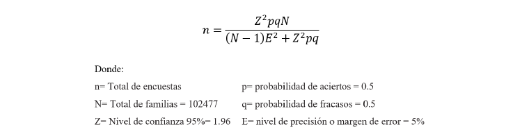 Una vez obtenido el número total de familias, se calculó el número de encuestas mediante la fórmula de Muestra Aleatoria Simple propuesta por Webster (2000), y la ventaja es que todas las muestras posibles de un determinado tamaño van a tener la misma probabilidad de ser elegidas: