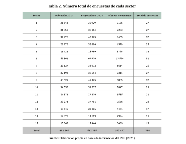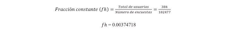 A partir de estos valores, la muestra de estudio necesitó 384 encuestas, las cuales fueron distribuidas en un número específico para cada sector, en base a una fracción constante que se obtiene de la división del total de encuestas entre total de usuarios, para luego multiplicar el valor resultante por el número de usuarios de cada sector (Maguiña, 2014).