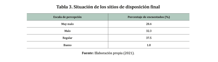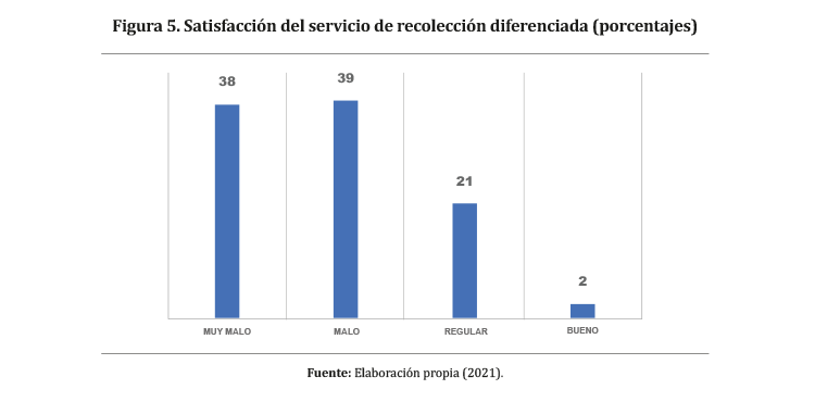 Mediante este resultado se hace implícita la desaprobación del servicio brindado por la Municipalidad del Callao, a pesar de que cuenta con la competencia de proveer los servicios de acuerdo con la ley 27972, Ley Orgánica de Municipalidades, y el decreto legislativo 1278-2016, Ley de Gestión Integral de Residuos Sólidos. En 2011, el MINAM creó el «Programa de Segregación en la Fuente y Recolección Selectiva de Residuos Sólidos Domiciliarios» para los gobiernos provinciales y municipales, con la finalidad de reducir la cantidad de los residuos sólidos dispuestos inadecuadamente, y también disminuir la cantidad de residuos sólidos que son destinados a los rellenos sanitarios, y generar un incremento de la conciencia ambiental en la ciudadanía (Rentería & Zeballos, 2014).