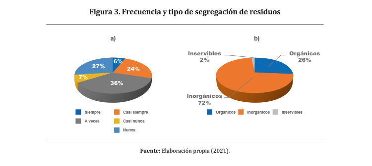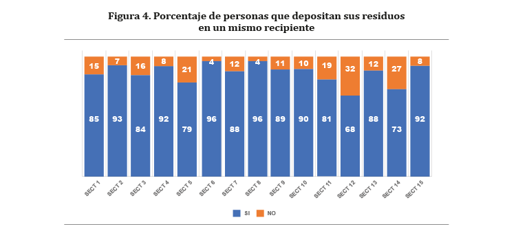 Esta falta de sensibilización e información sobre el manejo de los residuos domiciliarios tiene repercusión en el proceso de segregación por parte de las familias, ya que el 36% de la población encuestada respondió que «a veces» segrega en casa, siendo la respuesta más común (Figura 3a). Ante ello, se pone de ejemplo a la Municipalidad Distrital de Lince, que en su Plan de Manejo de Residuos Sólidos (2011, p. 63) señala que promover la segregación de residuos tiene como meta crear conciencia y cultura ambiental en la población. Asimismo, un promedio de 70% de encuestados combina sus residuos en un mismo recipiente, sin ningún tipo de distinción (Figura 4).