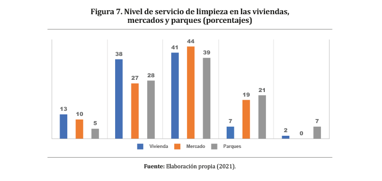 En la Figura 7 se registra el nivel de limpieza pública en las viviendas, mercados y parques a nivel del distrito del Callao. La percepción del servicio se catalogó con un nivel Regular y Malo; los picos con un nivel Malo y Regular para las viviendas son 37.76% y 40.89%, respectivamente; los picos con el nivel Malo y Regular para los mercados son 26.82% y 43.75%, respectivamente; y finalmente, los picos con un nivel Malo y Regular para los parques son 28.13% y 38.54%, respectivamente.
