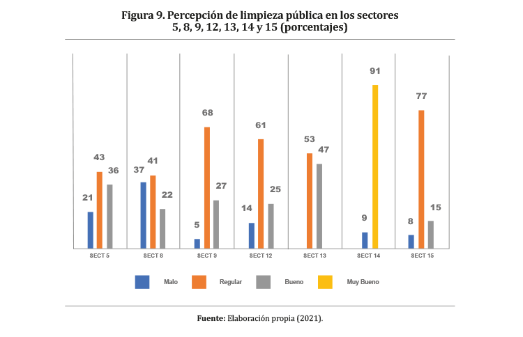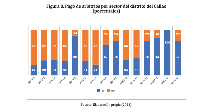 Por un lado, los factores económicos afectan directamente la eficiencia de la prestación del servicio de limpieza pública para atender parques, mercados y viviendas, por lo cual es importante la recaudación de tributos por parte de los municipios (Umaña, Gil, Salazar, Stanley & Bessalel, 2003, citados por Rivera, Jiménez, Quispe & Ramírez, 2020). En ese sentido, es necesario reducir la morosidad de pago de arbitrios municipales, ya que este factor impide a la Municipalidad mejorar la gestión integral de residuos sólidos y contratar servicios con óptimos estándares de calidad (Castillo, Martínez, Torbisco & Chong, 2019, citados en Rivera et al. 2020). En la Figura 8, se aprecia un bajo porcentaje de encuestados que pagan los arbitrios de limpieza pública en el distrito del Callao, en donde más del 50% no pagan sus arbitrios; no obstante, se destacan los sectores 5, 9, 12, 13, 14 y 15, los cuales presentan más del 70% de encuestados que pagan sus arbitrios, en consecuencia, son sectores que presentan mejores condiciones de servicio de limpieza pública, tal como se muestra en la Figura 9.