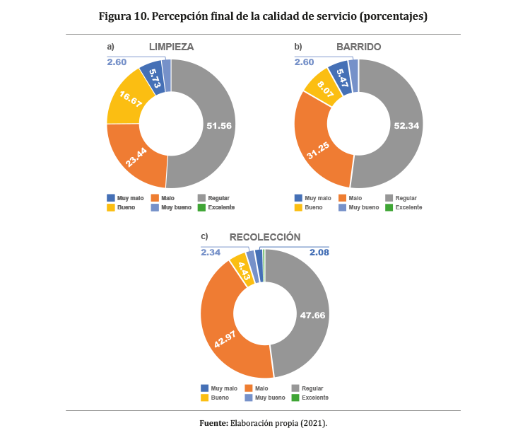 En la Figura 10 (a) se observa la percepción final de la población encuestada con respecto al nivel de servicio de limpieza pública en el distrito del Callao. En la Figura 10 (b) se muestra la calidad del servicio de barrido de residuos sólidos y en la Figura 10 (c), la calidad del sistema de recolección de residuos sólidos. De acuerdo con la gráfica, los vecinos encuestados del distrito del Callao consideran tener un servicio de limpieza, barrido y recolección, predominantemente de Regular y Mala calidad, esto en base a la información recolectada de los sectores encuestados.
