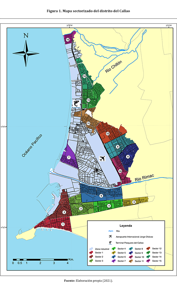 Para determinar el número de encuestas, como primer paso, se dividió el distrito del Callao en 15 sectores, con la finalidad de asignarle una cantidad respectiva de encuestas a cada sector (Figura 1). Luego se realizó una proyección de la población censal de cada sector del año 2017 al año 2020, donde se usó la tasa de crecimiento brindada por el INEI: