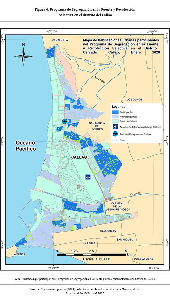 Para atender está deficiencia, en 2017 el Distrito del Callao aplicó un «Programa de Segregación en la Fuente y Recolección Selectiva de Residuos Sólidos Domiciliarios en Viviendas Urbanas» (El Peruano, 2017), y en 2018 se estableció un «Programa de Segregación en la Fuente y Recolección Selectiva para la Provincia Constitucional del Callao», que rige al ámbito de la Provincia de Callao y está en concordancia con el decreto legislativo 1278-2016 y su Reglamento, decreto supremo 014-2017 MINAM (El Peruano, 2018). Sin embargo, no se ha conseguido que la población sea partícipe de los objetivos establecidos en los programas de segregación porque, en base a la Figura 6, se observa que son pocas las viviendas que se han incluido en el programa.