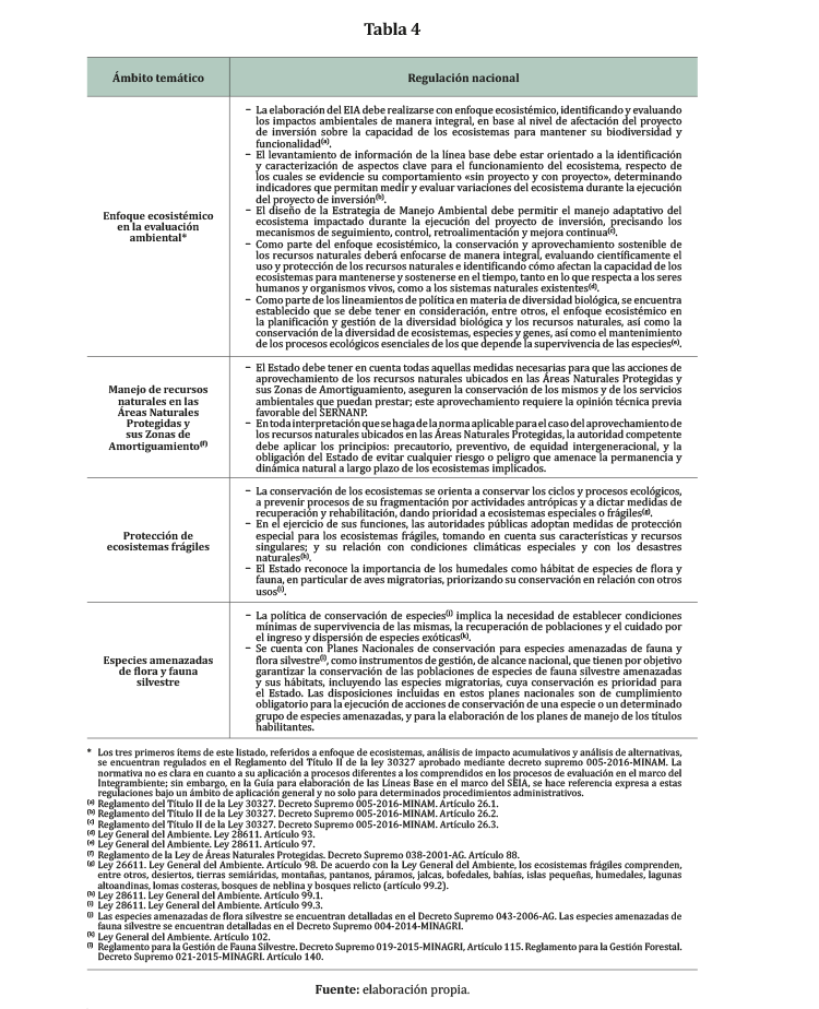 A continuación, se presentan las principales disposiciones normativas de naturaleza transversal (de aplicación a todos los proyectos en general) reguladas a nivel nacional y que deberían servir como el estándar aplicable para la consideración de la biodiversidad en la evaluación ambiental. Estas reglas, a su vez, son de aplicación en el ámbito de la evaluación ambiental en ANP: