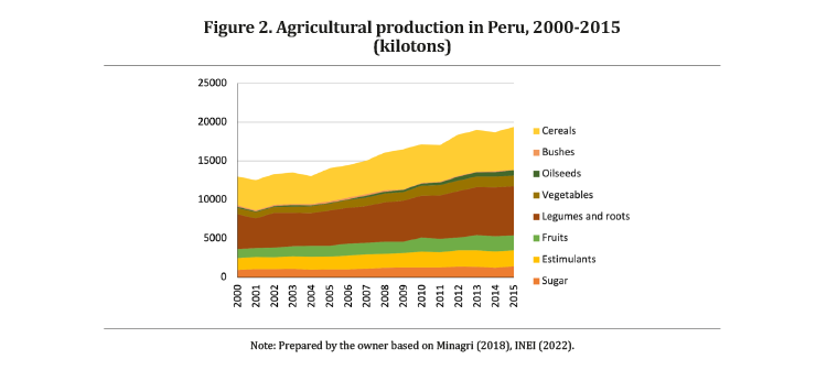 From 2000 to 2015 agricultural production grew 2% and the use of the land 1% (Minagri, 2018). In 2015, total production of agricultural products reached 19 373 tons, for which 2 444 827 hectares of land were used. The main products were grains, legumes and roots, fruits and stimulants over this period.
