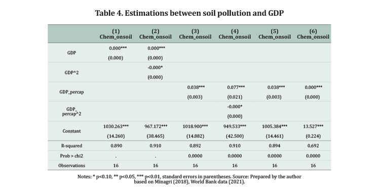 Pollution and economic activity are directly related with 99% confidence (equations 1,3,5). This result shows that the more the economy grows, the higher the amount of soil pollutants there will be. The chemical fertilizer indicator and GDP per capita were closely associated (equations 5 and 3). Use of chemical fertilizers grows 0.038 per every percentual point of GDP per capita.