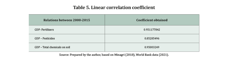 This linear correlation coefficient allowed us to know how data relate over time. The values vary between 1 and -1, values near 1 mean that the relation is positive and values near -1 mean that the relation is negative. Results show that the relation between GDP and total use of fertilizers is strongly positive; the same occurs with the total amount of chemicals on soil. The relation between pesticides and GDP is less strong, but it is positive.