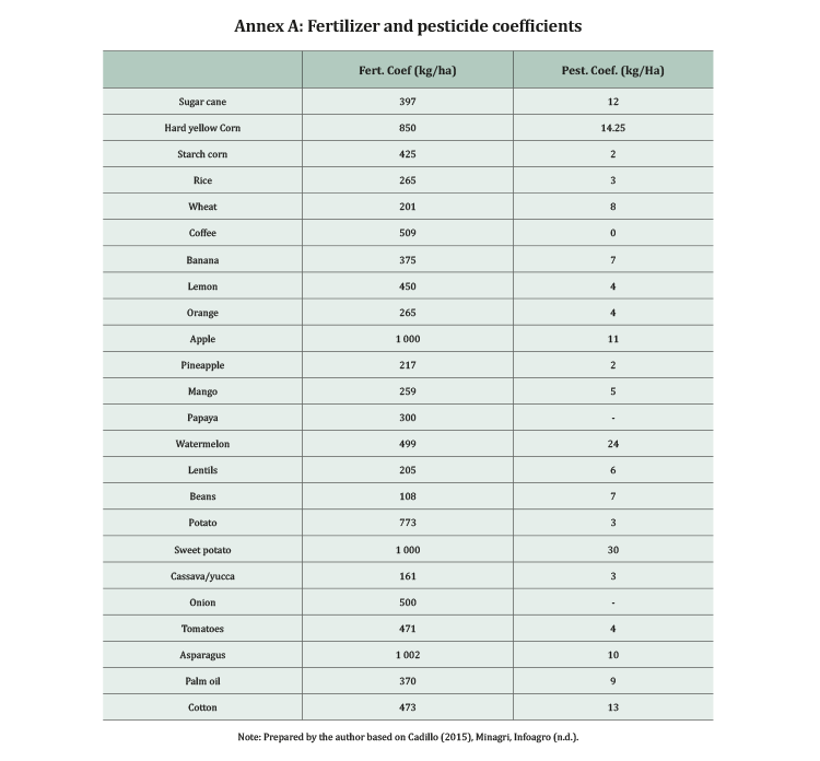According to Cadillo (2015), to estimate the use of fertilizers and pesticides, it is necessary to select 8 types of crops2, as described in the following table. Afterwards, once we have measured production and land use, we use specific coefficients3 to quantify the amount of fertilizers and pesticides.