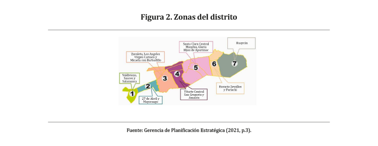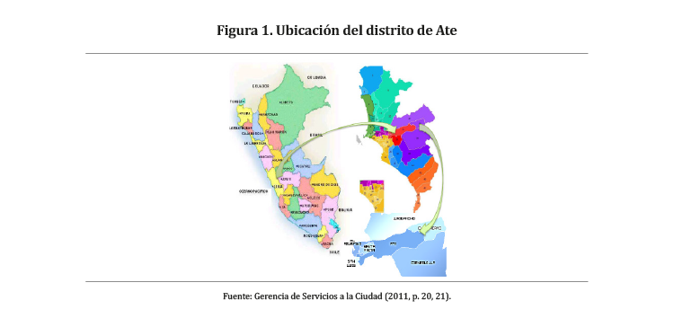 Este estudio se realizó en el distrito de Ate, ubicado en el Cono Este de la provincia de Lima, entre los kilómetros 16 y 17.5 de la Carretera Central. En la Figura 1 se puede apreciar la ubicación del distrito y sus límites, que serían: Por el Norte: Lurigancho-Chosica, San Juan de Lurigancho, Santa Anita, El Agustino. Por el Sur: La Molina, Cieneguilla, Santiago de Surco. Por el Este: Chaclacayo. Por el Oeste: San Luis, San Borja. Mientras que en la Figura 2 se observa la división de Ate en siete zonas.