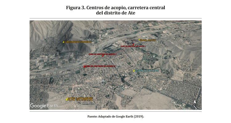 A continuación, en la Figura 3, se puede apreciar las zonas donde se encuentran focalizados la mayor cantidad de centros de acopio cercanos a la entrada de Huaycán, entre los kilómetros 16 y 17.5, respectivamente.