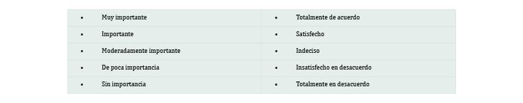 Sobre las encuestas, el cuestionario que se utilizó fue tipo escala de Likert. Este instrumento de medición se puede utilizar también para la recolección de datos cuantitativos, la cual se puede utilizar dentro de la investigación. Las opciones de respuestas utilizadas fueron: