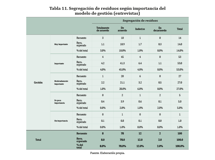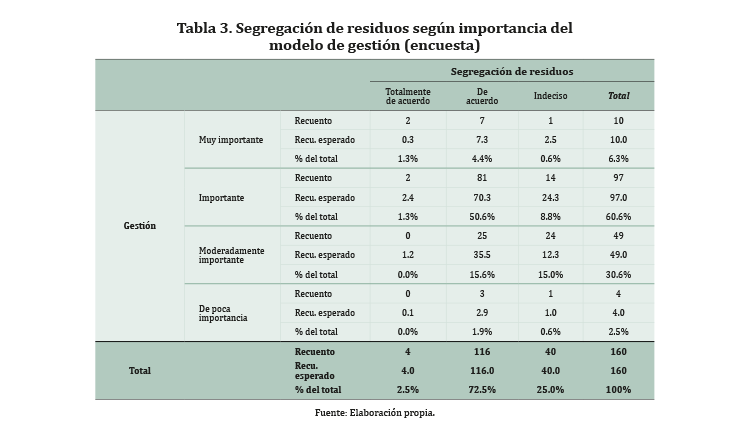 Prueba de hipótesis específica HE1 (resultados de la entrevista y encuesta): Mediante los resultados obtenidos a través de la prueba de hipótesis de chi- cuadrado, afirmamos que el modelo de gestión, por no utilizar estrategias adecuadas, influye significativamente (p < 0.05), tiene efecto negativo en los métodos de clasificación, almacenamiento y beneficio económico de residuos sólidos municipales en los centros de acopio informales de la Carretera Central del distrito de Ate, Región Lima. Por tal afirmación, consideraremos a esta prueba de hipótesis como verdadera en nuestro estudio.
