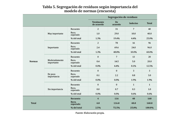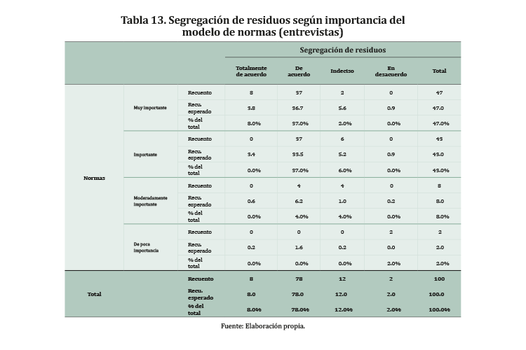 Prueba de hipótesis específica HE2 (resultados de la entrevista y encuesta): Según los resultados obtenidos mediante la prueba de hipótesis de chi- cuadrado, concluimos que el modelo de normas, por no ser muy específico y claro, influye significativamente (p < 0.05), tiene efecto negativo en los métodos de clasificación, almacenamiento y beneficio económico de residuos sólidos municipales en los centros de acopio informales de la Carretera Central del distrito de Ate, Región Lima. Por esta razón, consideraremos como válida la hipótesis planteada.