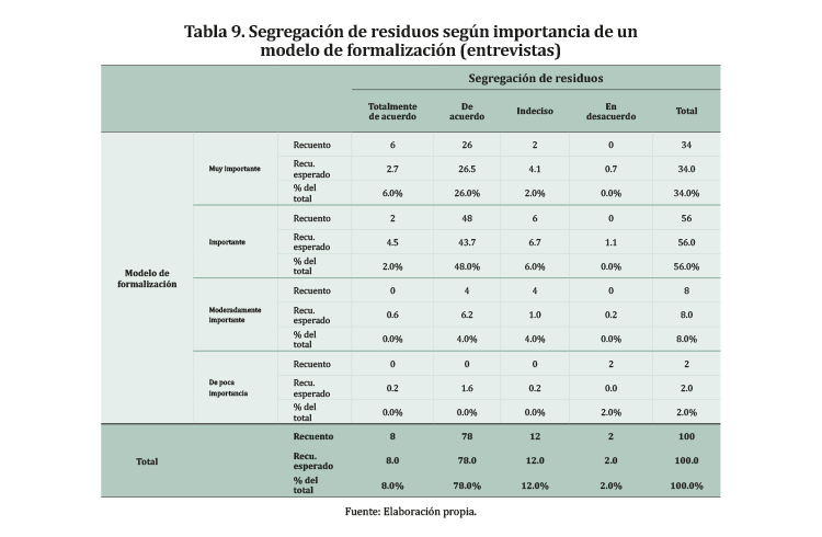 Contrastación de la hipótesis general H0: Debido a que el valor de significación (valor crítico observado) es 0.000 < 0.05, rechazamos la hipótesis nula (H0) y aceptamos la hipótesis alternativa (H1). Es decir que el modelo de formalización, por no utilizar sistemas de información adecuados, tiene efecto negativo en la segregación de residuos sólidos en los centros de acopio informales.