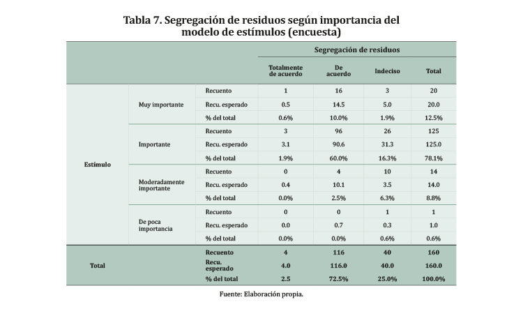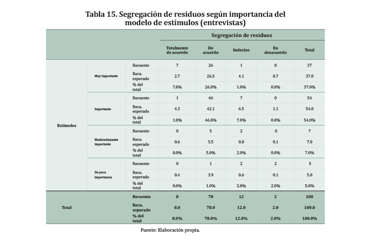 Prueba de hipótesis específica HE3 (resultados de la entrevista y encuesta): De acuerdo a los resultados obtenidos mediante la prueba de hipótesis de chi-cuadrado, podemos afirmar que la aplicación del modelo de estímulos, por no ser motivador, influye significativamente (p < 0.05) y tiene efecto negativo en la aplicación de los métodos de clasificación, almacenamiento y beneficio económico de residuos sólidos municipales en los centros de acopio informales de la Carretera Central del distrito de Ate, Región Lima. De esta manera, consideramos válida la hipótesis analizada.