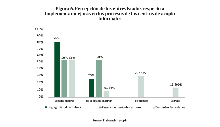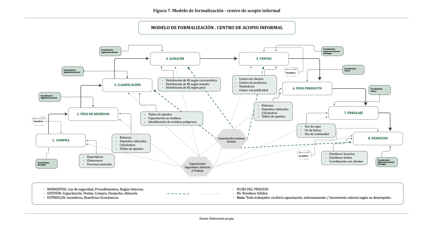 Es importante que los centros de acopio informales realicen un modelo de formalización y lo implementen en sus establecimientos, con esto se busca lograr que cada centro de acopio pueda establecerse formalmente, trayendo con esto muchos beneficios, tanto económicos y sociales, para los trabajadores que laboran en ellas. La formalización brinda oportunidad de desarrollo, mejora la actividad económica de estos lugares, otorga mejores beneficios a sus trabajadores, brinda mayor estabilidad como empresa, mejora el entorno con respecto a la seguridad para sus trabajadores y da oportunidad de tener un futuro más estable y duradero.
