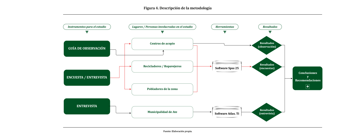 El trabajo de investigación se realizó durante el segundo periodo del año 2020, para ello se utilizaron instrumentos como encuestas, cuestionarios y guías de observación, con la finalidad de recaudar la mayor cantidad de información sobre el funcionamiento de los centros de acopio informales. Para esto se realizaron 160 encuestas. De estas, 100 fueron mediante el aplicativo Google drive, que se distribuyó mediante el uso del WhatsApp, y 60 se realizaron de manera presencial. Del mismo modo, se tomaron 100 entrevistas estructuradas, de las cuales 70 fueron también realizadas mediante Google drive a través del WhatsApp, y 30 fueron de manera presencial. Se realizó también una entrevista no estructurada a un especialista encargado del tema de manejo de residuos sólidos de la Municipalidad Distrital de Ate. Se finalizó el trabajo de campo con la inspección de 6 centros de acopio del lugar utilizando para esto la guía de observación.