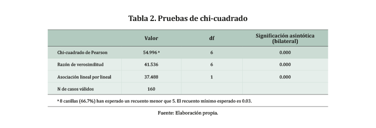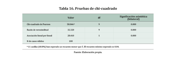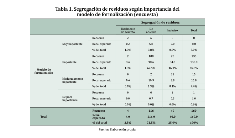 Prueba de hipótesis general H0: De los resultados obtenidos al realizar la prueba de hipótesis de chi-cuadrado, podemos dar por afirmado que el modelo de formalización, por no utilizar sistemas de información adecuados, influye significativamente (p < 0.05) y tiene efecto negativo en la segregación de residuos sólidos en los centros de acopio informales de la Carretera Central del distrito de Ate, Región Lima. Por tal motivo, debemos de considerar esta hipótesis como verdadera.