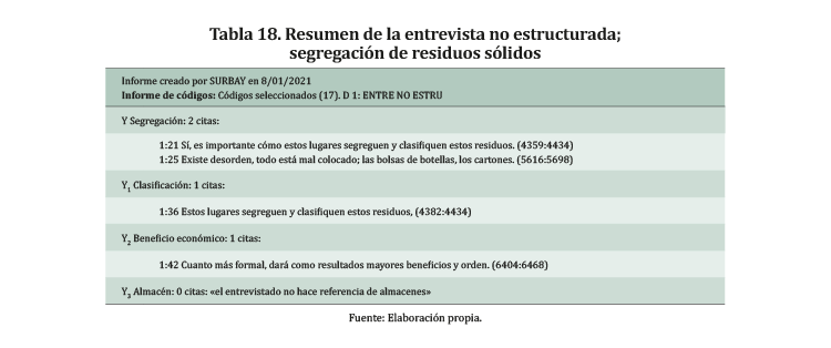 El recojo de información se hizo a través de la elaboración de encuestas, entrevistas y la observación. Se realizaron 160 encuestas, de las cuales 100 fueron de forma virtual y 60 de manera presencial. Se entrevistó a 100 personas, de las cuales 70 fueron en forma virtual, y las otras 30, que se hicieron de manera presencial, estuvieron dirigidas a las personas que laboran en los centros de acopio informales, a los recicladores y a las personas que viven en la zona de estudio[2].