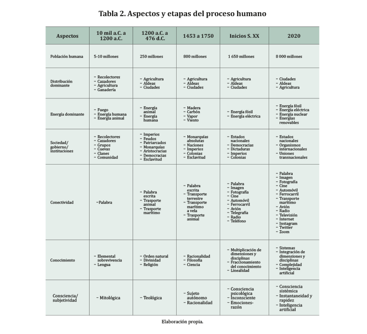En la Tabla 2 se presentan muy esquemáticamente algunos momentos del proceso humano a partir del Paleolítico hasta nuestros días. Se puede visualizar el incremento poblacional, el tipo de asentamiento, la energía dominante usada, el sistema social, la conectividad, el conocimiento y la subjetividad. El sistema humano se encuentra en continua transformación, sobre el que influyen procesos en varias dimensiones. En otras palabras, su identidad se configura y reconfigura, su subjetividad se modifica y se amplía, su creatividad se potencia.