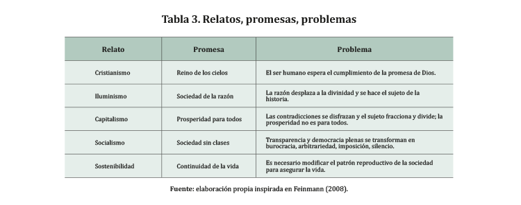 En el curso de los últimos veinte siglos la consciencia humana ha registrado varios relatos y promesas que han fracasado en su intento de transformar integralmente los vínculos y las prácticas afectivas en las sociedades de las que surgieron. La promesa del cristianismo fue el reino de los cielos, y la humanidad se dedicó a esperar. Como dice Feinmann: «cuando el hombre vive en la espera, el dinamismo histórico se extravía, la historia deviene con una enorme lentitud, los hombres han depositado la iniciativa en Dios, y al hacerlo pierden su propio dinamismo y creatividad históricos» (2008, p. 16). La promesa del iluminismo fue la muerte de Dios, el predominio de la razón y la aparición de un nuevo sujeto que hace la historia: «Descartes mata a Dios porque de lo único que no duda es de su subjetividad» (Feinmann, 2008, p. 17). Cuando el hombre asume la conducción, surge el capitalismo. La consciencia de la subjetividad del hombre es la negación de lo dado porque se altera la pasividad que espera y se transforma en la actividad que hace, construye, conquista. La promesa del capitalismo es el progreso de todos. Pero ese hacer también produce obstáculos, contradicciones o dilemas que dividen, fraccionan y sobrepasan la linealidad que la razón hasta entonces admite, configurándose un universo complejo. Emerge una contradicción que no puede ser resuelta en la lógica del sistema creado.