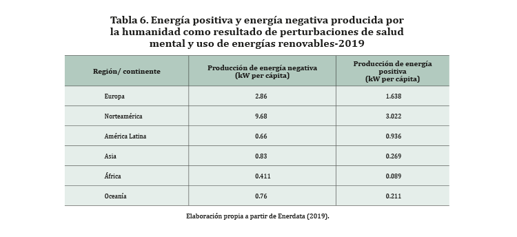La Tabla 6 sugiere que a partir de vínculos que se manifiestan en la perturbación de la salud mental y en el uso de energías no renovables la energía social que produce la humanidad (2019) podría ser predominantemente negativa.