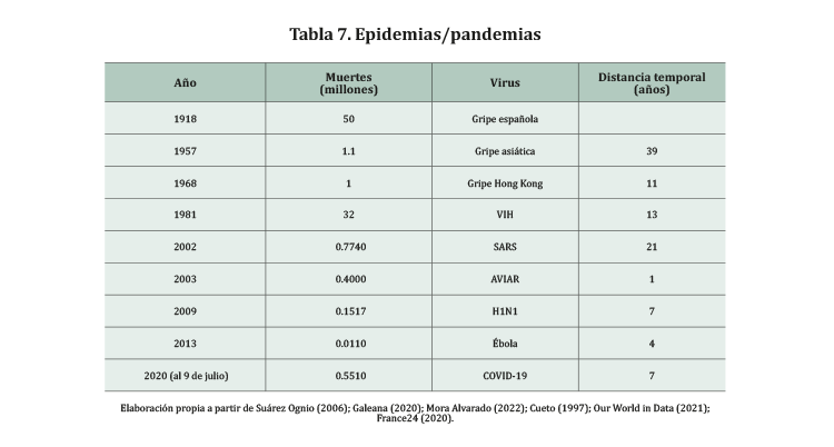 Si bien el tema de las epidemias se había experimentado a lo largo de los últimos cien años, la aparición del COVID-19 mostró que ningún país estaba preparado para enfrentar esta pandemia. Como se puede ver la Tabla 7, en un siglo han ocurrido nueve epidemias/pandemias. La frecuencia de estas se ha hecho más rápida, pues antes de 2002 eran más espaciadas, después de ese año se han hecho más frecuentes.