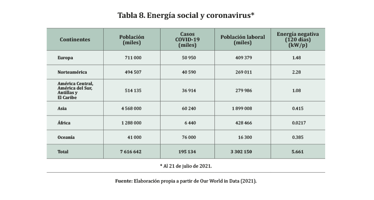 El número de infectados tiene una importancia menor para los cálculos porque, en realidad, toda la población se ve afectada, independientemente de su condición de salud. En la Tabla 8 se muestra la población total, casos de COVID-19, población laboral y energía social negativa según regiones (continentes). La energía social negativa se ha estimado bajo el supuesto de que, a lo largo del año, el tiempo en el que no se trabajó y hubo un aislamiento social, generando vivencias negativas en la población laboral o adulta, puede llegar a ser equivalente a 120 días. A lo largo de ese periodo tenderá a haber una predominancia de energía negativa. En otras palabras, el balance de la energía social será negativo. Habrá, desde luego, energía positiva, pero la que dominará será la energía negativa. Solo por la presencia del COVID-19, el continente americano habría generado 3.36 kW/persona por día de energía social negativa en el periodo 2020-2021 bajo los supuestos señalados. Otros elementos, como salud mental y uso de energías renovables, sumados a los efectos del COVID-19, ampliaron el peso de la energía negativa, como se puede ver en la Tabla 9.