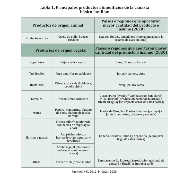 Mientras estos escenarios ocurren en el territorio local metropolitano, su sistema alimentario prioriza su relación con cadenas económicas nacionales o globales para garantizar el acceso a suficientes y variados alimentos. Estas cadenas económicas proveen alimentos y productos derivados que conforman la canasta básica familiar de Lima Metropolitana, la que se detalla a continuación: