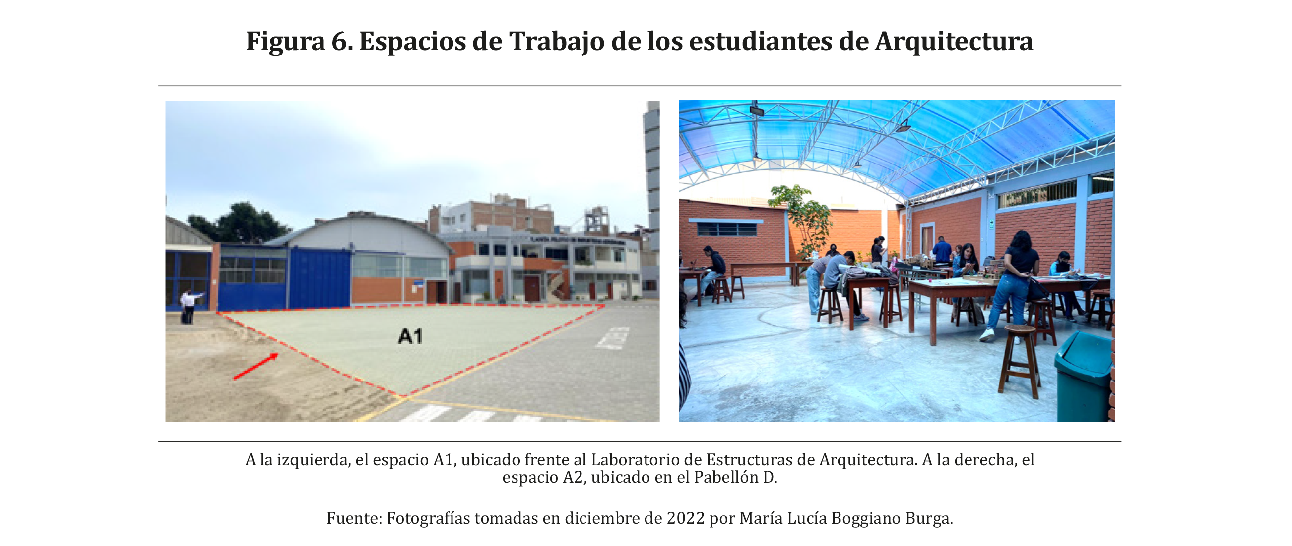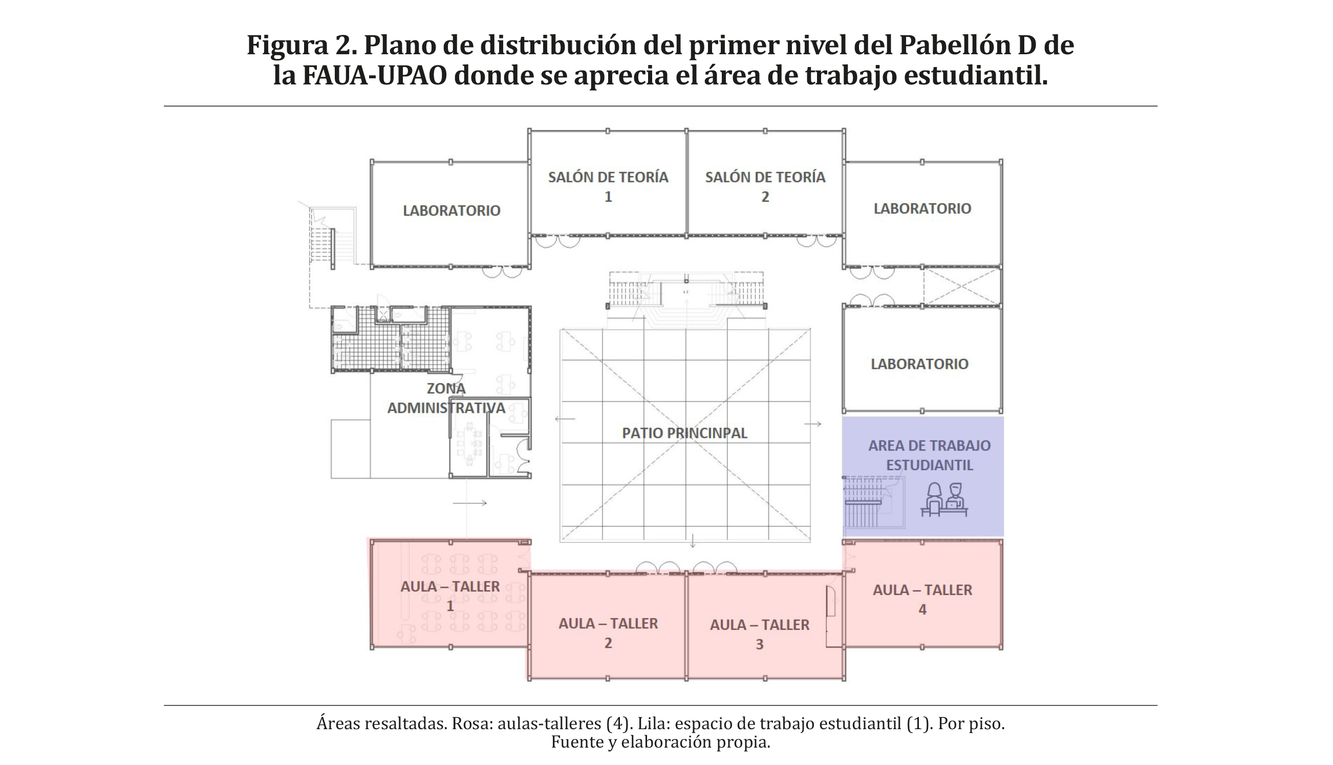 La facultad cuenta con un Programa de Estudio de Arquitectura, cuyas clases, en su mayoría son de carácter práctico y se vienen dictando, desde hace 30 años, en los Pabellones C y D, que presentan similar configuración y diseño en sus 4 niveles. Cada edificio cuenta con un patio central, punto de encuentro social y del cual se distribuyen las aulas, los laboratorios y la zona administrativa. El único espacio para el trabajo estudiantil se encuentra en el Pabellón D y tiene un área de 90 m2 (figura 2). El diagnóstico realizado se respaldó por un registro fotográfico.